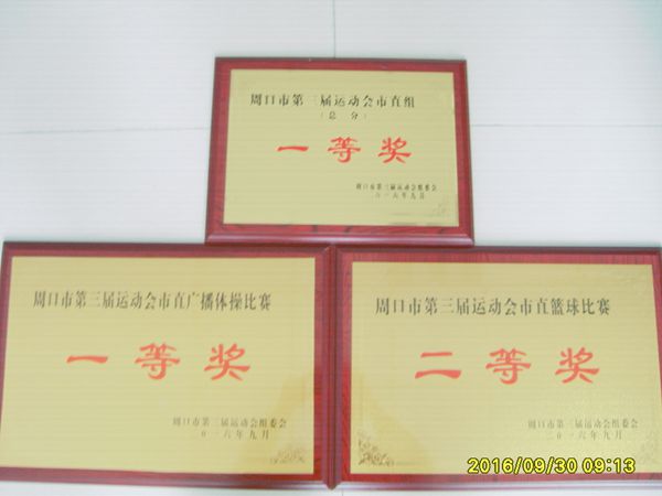 9月29日下午4点,周口市第“三届运动会”闭幕式暨颁奖仪式在周口市体育馆隆重举行。市机关事务管理局运动员经过5个月7个项目的比赛,取得了优异成绩,获得市直组总分、广播体操比赛一等奖;男子篮球比赛二等奖等,通过比赛活动,赛出了风格,赛出了友谊,提高了水平,锻炼了体质,收获了快乐。