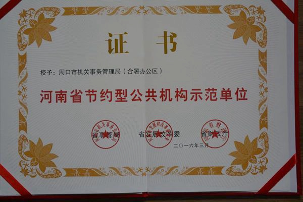 2014至2016年度,周口市机关事务管理局历经申报、创建、初评、公示、验收、复核、表彰等系列环节,获得第二批“河南省节约型公共机构示范单位”荣誉称号。